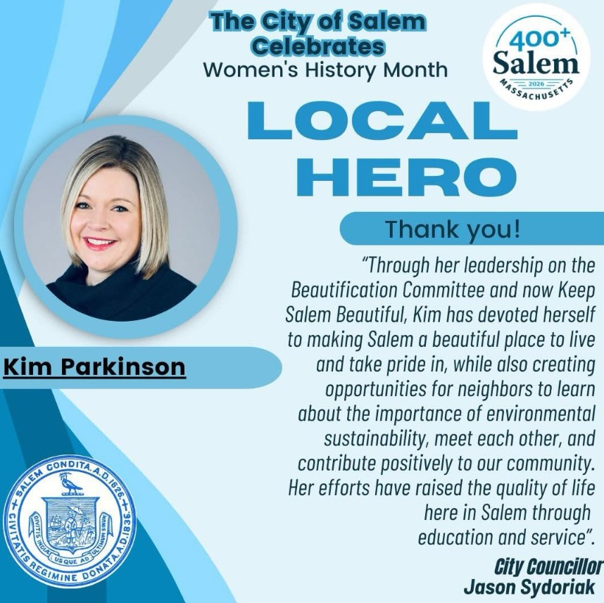 To celebrate Women’s History Month, Mayor Dominick Pangallo and the City of Salem highlighted the strength, resilience, contributions and achievements of everyday heroes in our community. Our very own, Kim Parkinson, was aknowledged for her work through the Salem Beautification Committee and Keep Salem Beautiful! Thank you to Kim and all of the incredible women in Salem who dedicate so much time and effort into helping make Salem a wonderful place to live, work and play!